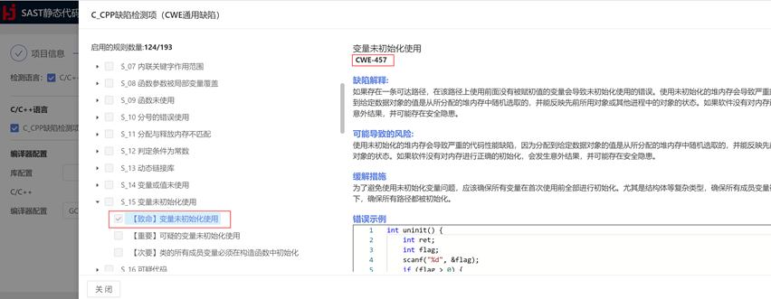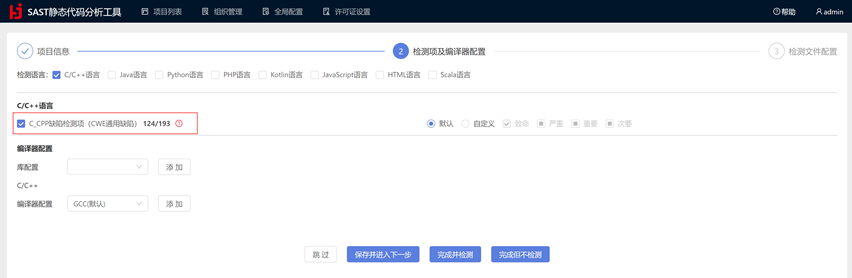 Click next to set the detection rules and compiler, as shown in Figure 10. Click the "question mark" button behind the rule set to set the defect rules. The corresponding CWE number can be viewed after each defect, as shown in Figure 11.