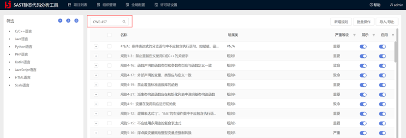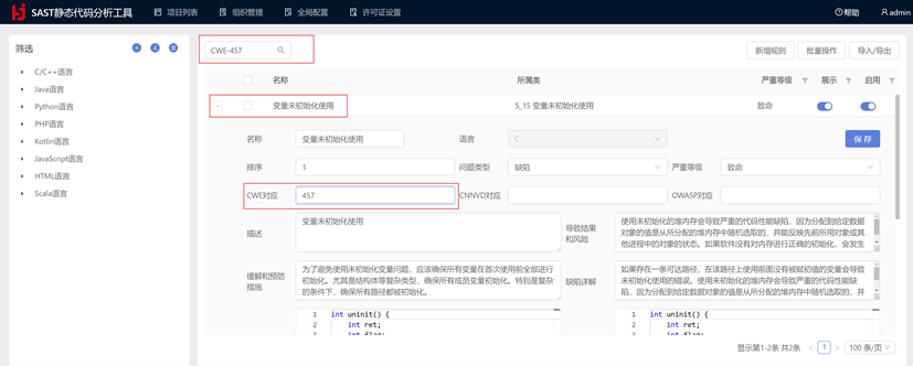 In the detection rule configuration page, enter the CWE number in the search box to find the defect corresponding to the specified CWE number, as shown in Figure 15.