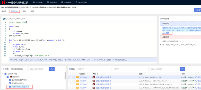 After the detection, the user can click the project name to view the detected defects, and display the specific defects under the "problem list" tab. Click a problem to display the corresponding CWE number in the defect information area, as shown in Figure 17.