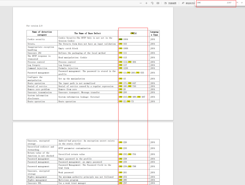 Our electronic document format is PDF or WORD. So users can easily search for specific CWE-related text by keyword searching. For example, we open the CWE Mapping Relations document, and search "cwe" by pressing "Ctrl + f", as shown in figure 19.