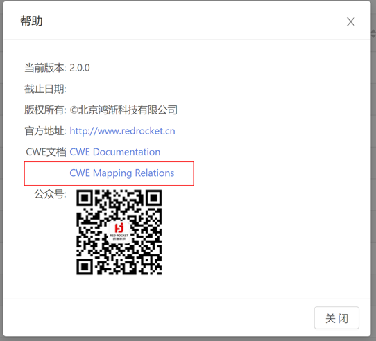 Users can view CWE through the product homepage, and click the help button in the upper right corner to view CWE mapping relations file, as shown in Figure 7 and figure 8.