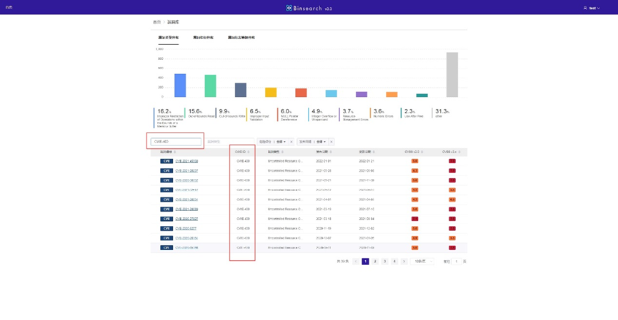 After logging in to the system, users can view the list of CWEs supported by BinSearch on the "漏洞类型分布(type distribution)" module, as shown in the figure 13.